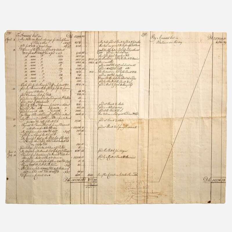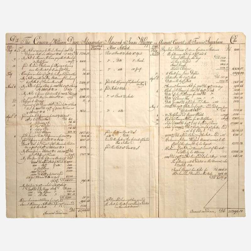 (Philadelphia), July 20, 1792. One sheet, 17 3/8 x 22 3/8 in. (441 x 568 mm) Manuscript ledger sheet, titled “The Concern of William Duer, Alexander Macomb & Isaac Whippo in Account Current with Francis Ingraham”, detailing Ingraham's extensive financial activity with Duer, Macomb, and Whippo, et al., totaling $301,286.39. Endorsed on verso by Ingraham: “July 20 1792/Error Excepted/Francis Ingraham.” Unevenly toned; old folds; scattered ink stains.