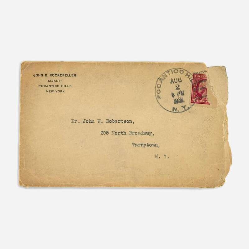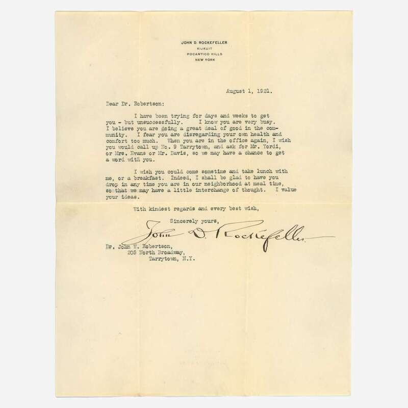 Pocantico Hills, New York, August 1, 1921. One sheet, 10 3/8 x 8 in. (264 x 203 mm). Typed letter, signed by American business magnate John D. Rockefeller, on his Kijkuit House stationery, to physician Dr. John W. Robertson of Tarrytown New York: "Dear Dr. Robertson:/I have been trying for days and weeks to get/you-but unsuccessfully. I know you are very busy./I believe you are doing a great deal of good in the com-/munity. I fear you are disregarding your own health and/comfort too much. When you are in the office again, I wish/you woul call up No. 9 Tarrytown, and ask for Mr. Yordi,/or Mrs. Evans or Mr. Davis, so we may have a chance to get/a word with you./I wish you could come sometime and take lunch with/me, or a breakfast. Indeed, I shall be glad to have you/drop in any time you are in our neighborhood at meal time,/so that we may have a little interchange of thought. I value/your ideas./With the kindest regards and every best wish,/Sincerely yours,/John D. Rockefeller"; creasing from contemporary folds; with original mailing envelope.
