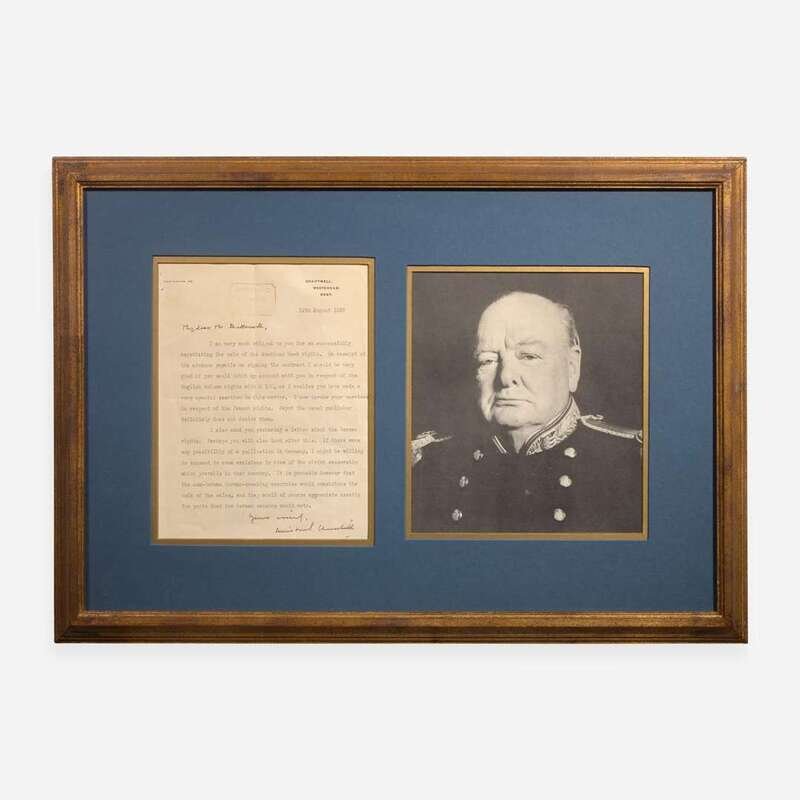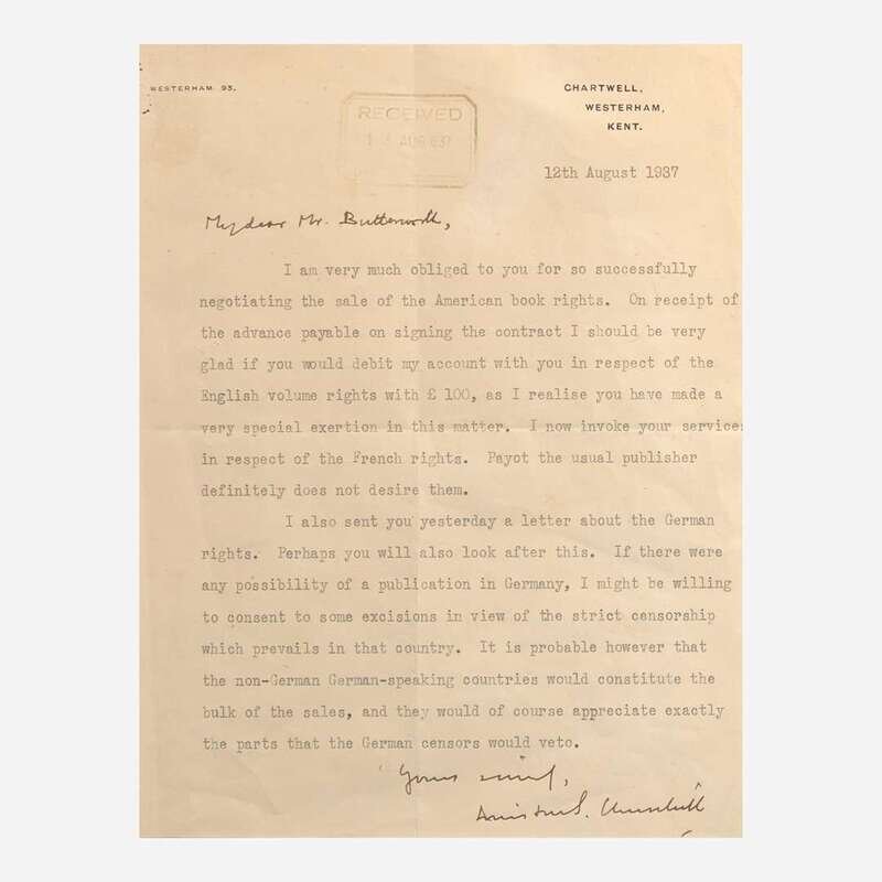 Chartwell, Westerham, Kent, August 12, 1937. One sheet, 9 7/8 x 7 3/8 in. (251 x 187 mm). Typed letter on Churchill's Chartwell headed stationery, signed by Churchill, to his British publisher, Thornton Butterworth, regarding the publication of Churchill's book Great Contemporaries: "My dear Mr. Butterworth,/I am very much obliged to you for so successfully/negotiating the sale of the American book rights. On receipt of/the advance payable on signing the contract I should be very/glad if you would debit my account with you in respect of the/English volume rights with £ 100, as I realise you have made a/very special exertion in this matter. I now invoke your services/in respect of the French rights. Payot the usual publisher/definitely does not desire them./I also sent you yesterday a letter about the German/rights. Perhaps you will also look after this. If there were/any possibility of a publication in Germany, I might be willing/to consent to some excisions in view of the strict censorship/which prevails in that country. It is probable however that/the non-German German-speaking countries would constitute the/bulk of the sales, and they would of course appreciate exactly/the parts that the German censors would veto./Yours sincerely,/Winston S. Churchill"; Butterworth's "Received 13 Aug 1937" ink stamp at top. Creasing from original folds. In mat with portrait of Churchill, and in frame, 17 x 24 in. (432 x 610 mm).