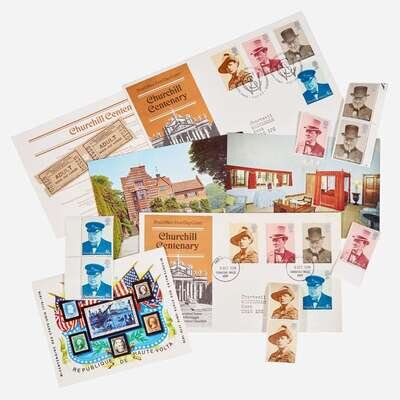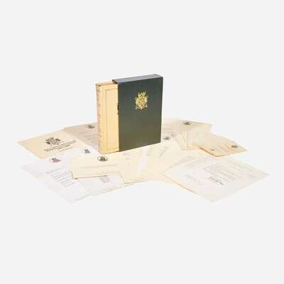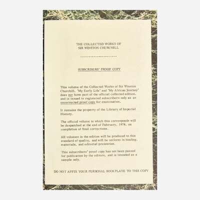 Lot includes a large group of printed ephemera from the publisher, including 33 printed book-plates for Vols. II-XXXIV, as well four book-plates for the four volumes of The Collected Essays, loose as mailed; original printed prospectus booklet for The Collected Essays; one typed letter from The Winston Churchill Foundation confirming original owner's subscription, dated December 3, 1973; nine typed letters from The Library of Imperial History regarding the subscription of this set, dated December, 1973-September, 1975; five pieces of publisher's ephemera, including Preliminary Notes, Conditions of Sale, Notes on Care and Preservation, etc.; six other pieces of ephemera, including Centenary stamps and postcards.