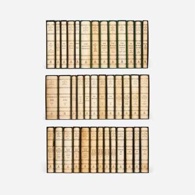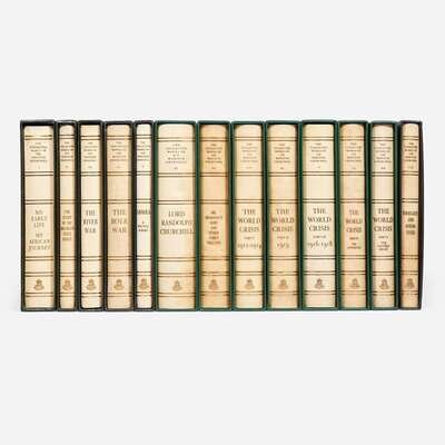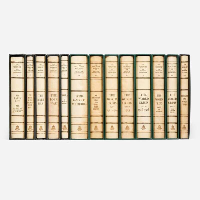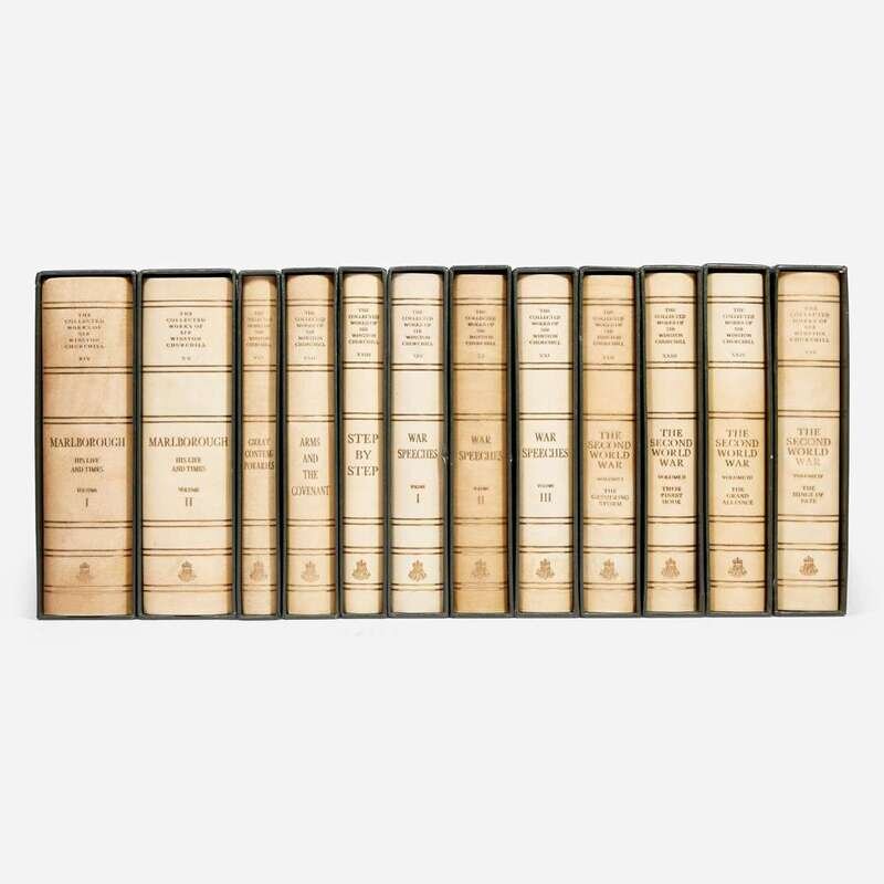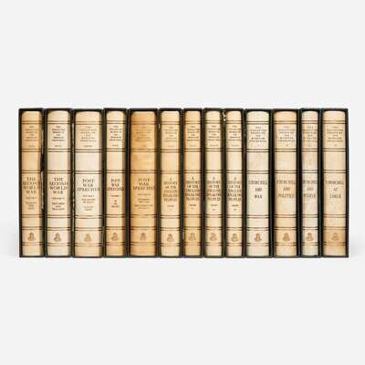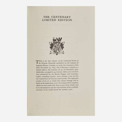 The first complete collection of Winston Churchill's works, comprising 50 books in 34 volumes, plus four volumes of his collected essays, and one publisher's proof copy of the first volume. "Five million words, in 19,000 pages, weighing 90lbs, taking up 4 1/2 ft of shelf space. To achieve publication, 11 publishing houses in Great Britain, the United States and Canada released their individual copyrights, in exchange for the promise that no other complete collection of Churchill's works would be published until the expiration of international copyright in 2019." (Richard M. Langworth, A Connoisseur's Guide to the Books of Sir Winston Churchill, p. 362). Although, according to Langworth, the publisher intended for 3,000 copies to be printed, the set's high price limited its sale, and when the publisher eventually declared bankruptcy in the late 1970s, only 2,000 sets of sheets were printed, of which only 1,750 copies were bound and presumably sold. In one of the publisher's letters included with this lot they note that this set is #2031.
