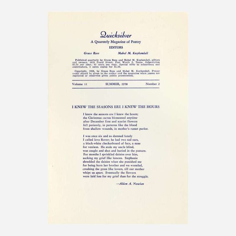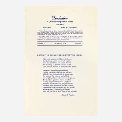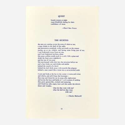 An early publication of Bukowski's poetry, and his first appearance in the Quicksilver Quarterly (his 19th published appearance overall). Overall, Quicksilver published his work in seven issues between 1958-62. Along with his publishing in other literary magazines like Hearse, Approach, Trace, Compass Review, and the San Francisco Review, this period represented a turning point in Bukowski's career and the beginning of his larger critical and popular reception.