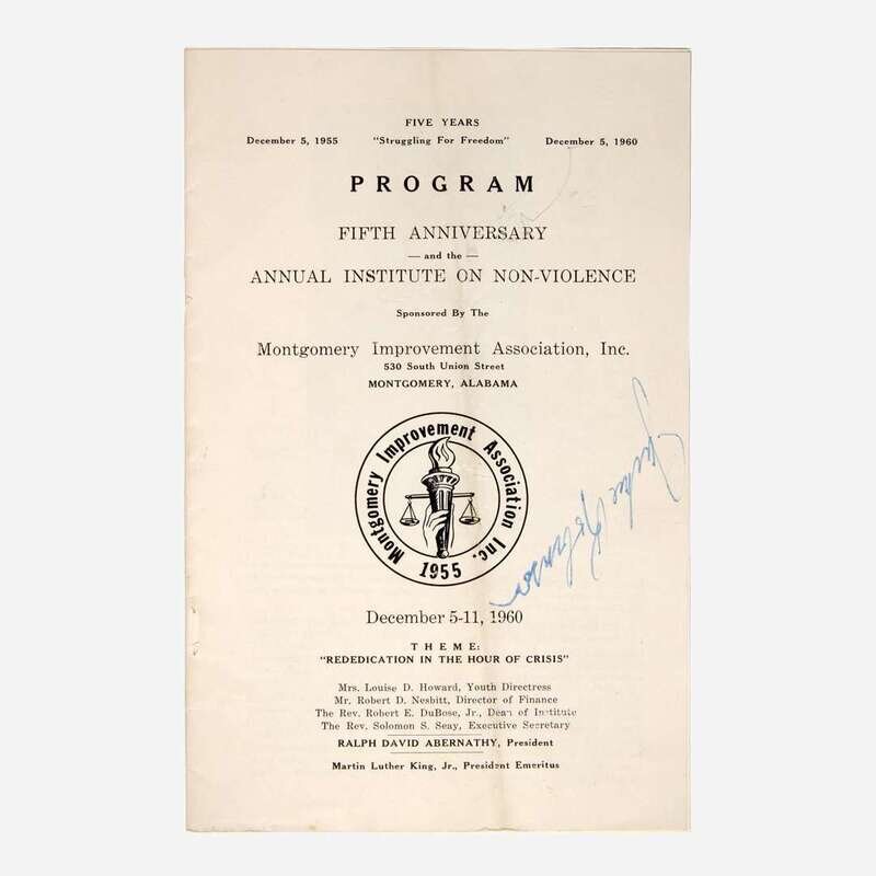 Montgomery, Alabama: Montgomery Improvement Association, Inc., 1960. First edition. 8vo. Unpaginated (16 pp.). Original printed program for the "Fifth Anniversary and the Annual Institute on Non-Violence Sponsored By The Montgomery Improvement Association...December 5-11, 1960." Signed by baseball legend and civil rights icon Jackie Robinson, on front wrapper. Original stiff staple-bound printed self-wrappers, staples now perished; creased along center.