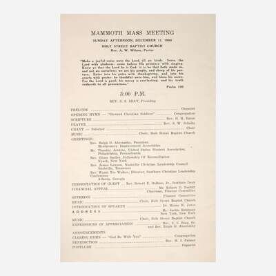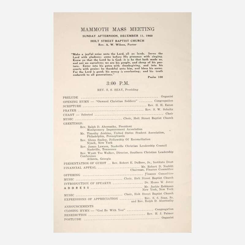 Jackie Robinson gave the closing speech for the Montgomery Improvement Association's (M.I.A.) fifth anniversary celebration on the afternoon of Sunday, December 11, 1960, the final day of their week-long schedule of masses and meetings that took place in many of Montgomery's prominent Baptist and Methodist churches. Robinson signed this program immediately following the completion of his speech, for Sharon Waters, daughter of Alfonso and Lucy B. Campbell, among some of the early organizers of the Montgomery Bus Boycott, and friends of Martin Luther King, Jr. "I attended a mass meeting at Rev. Ralph Abernathy's First Baptist Church and afterwards there were literally hundreds of people trying to get Robinson's autograph," as Sharon recalled of that afternoon, "I kept screaming loudly, 'I'm Sharon!, I'm Sharon!' knowing that his 10-year-old daughter was also named Sharon. Anyway, he kept hearing the screaming, looked at me, smiled, and reached over many people to sign my program."