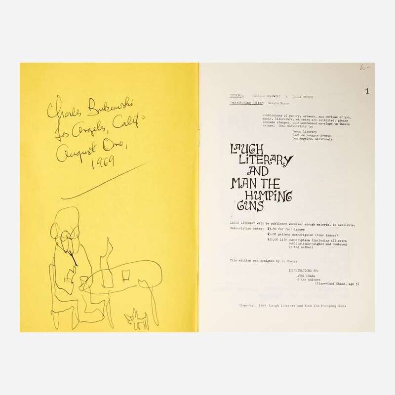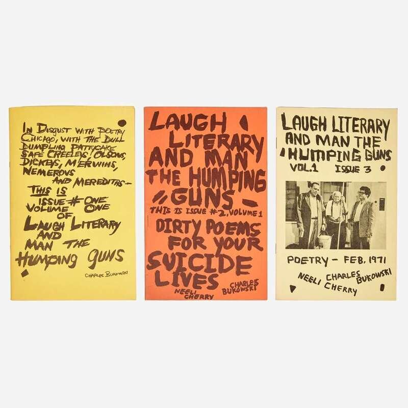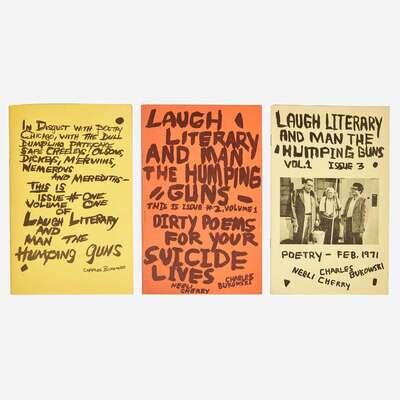 (Los Angeles), 1969-71. In three volumes. Vol. 1, Issues 1-3; complete run of this short-lived literary magazine, edited by Charles Bukowski and Neeli Cherry. 8vo. Issue #1 signed and dated by Bukowski, "Charles Bukowski/Los Angeles, Calif/August One,/1969", and with a doodle by him below his signature of a man and dog at a table with a bottle; Issue #2 signed by Bukowski, and with a doodle by him below his signature of a man with a bottle; Issue #3 signed by Bukowski; each on verso front wrapper. Original stiff staple-bound yellow and orange printed wrappers; all edges trimmed.