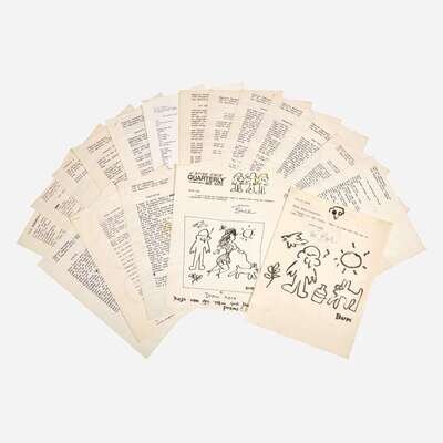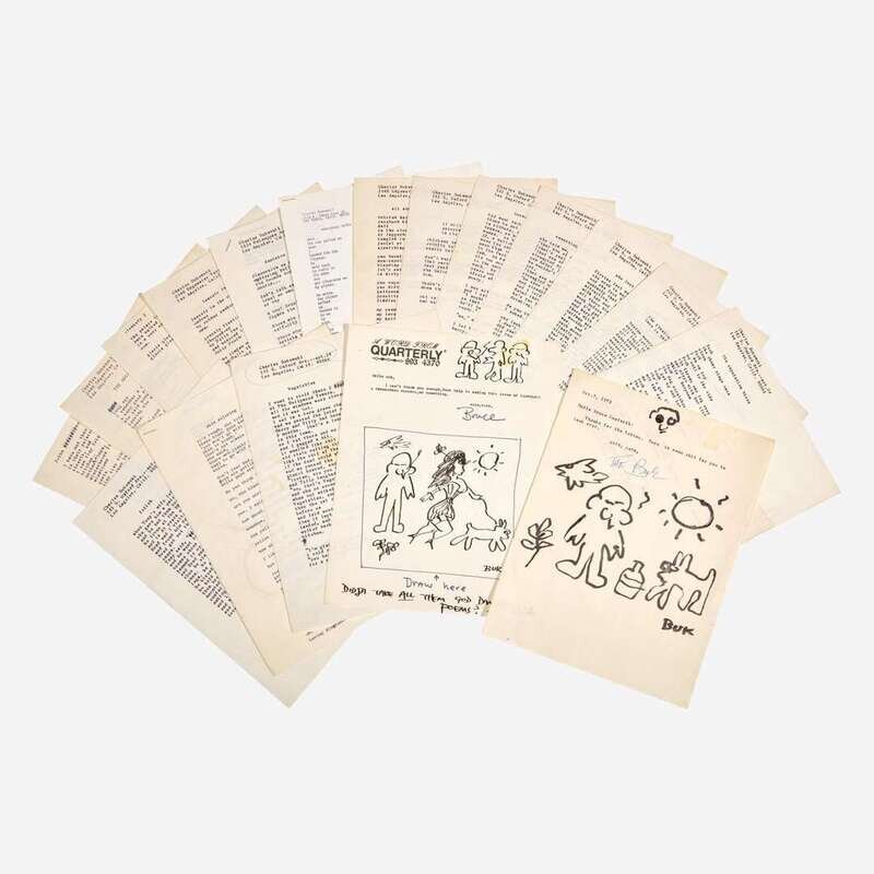 Los Angeles, California, ca. 1973. Group of 11 carbon typescript poems, presumably sent to the literary magazine Slowglass (Montclair State College, New Jersey: Colorama Press, 1973), including loosely loosely (2 pp.); The Arcade Room (2 pp.); all about; it will come on padded feet carrying roses, wine and the yellow pages in its mouth; burned; something about a cat; she lost weight; the shooting of the sperm and the shooting up with love is only a partial process; Vegetables; the copulation blues; fetish. Includes two short typed letters, with large black and white illustrations by Bukowski, each signed "Buk", ca. 1973; some poems with corrections, presumably in Bukowski's hand. Scattered creasing and light soiling to each sheet.