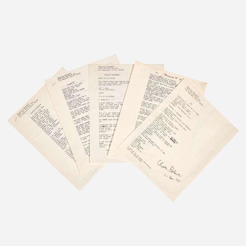 A collection of five original carbon typescript poems included in Bukowski's popular anthology of poetry, Love is a Dog from Hell (Black Sparrow Press, 1977). Bukowski wrote these poems during one of the most productive moments in his long and prolific career. They were written during the period when Bukowski met his second wife, Linda Lee Beighle, and the collection traces Bukowski's often volatile past relationships. It was customary at the time for Bukowski to make carbon copies of his work like these, sign and date them, and them send them to his publisher, Black Sparrow Press.