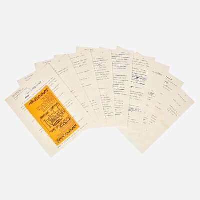 Los Angeles, California, ca. 1977. Nine typescript sheets, each measuring 11 x 8 1/2 in. (279 x 216 mm); sheets numbered in type at top right corner; Bukowski's typed Los Angeles address in top left corner of each sheet; extensively revised in Bukowski's hand with additions, emendations and deletions in blue and black ink; signed and dated by him on final sheet ("Charles Bukowski/9-25-77"); each sheet creased from contemporary fold; scattered soiling. With an original printed sample cover design used in the Black Sparrow Press publication, with Bukowski's additional decorative flourishes in ink, and signed by him, 7 3/4 x 4 1/2 in. (197 x 114 mm). The trade edition of this book features this same design for its cover, and the limited deluxe edition (only 75 copies) features additional unique ink flourishes similar to this sample.