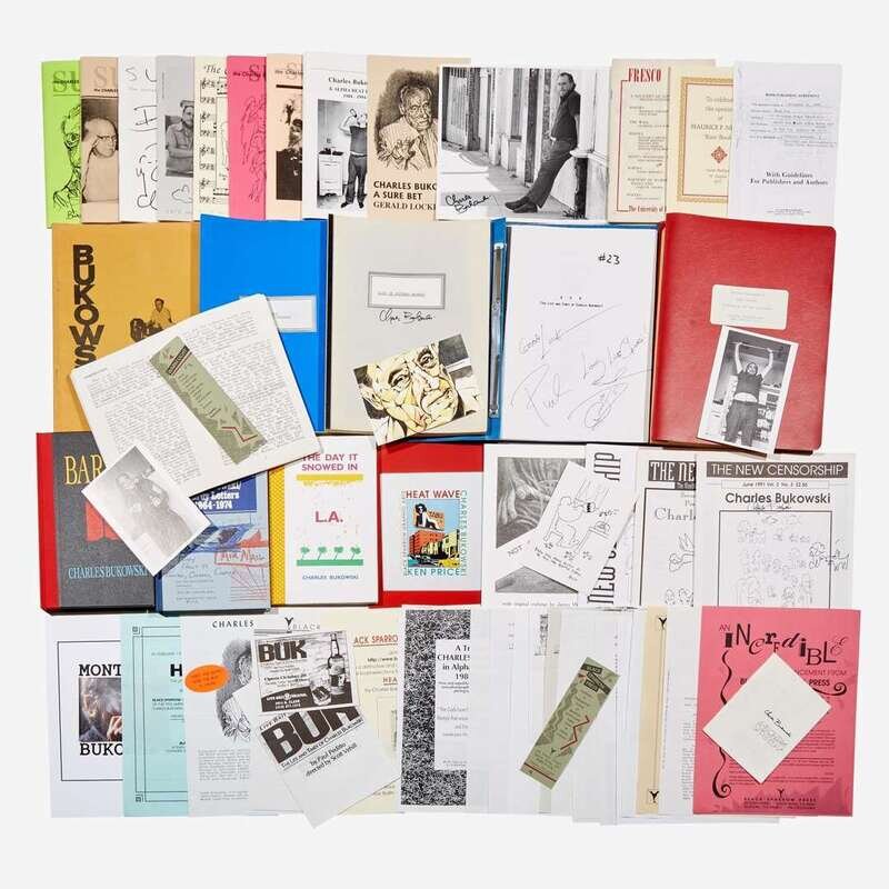 Lot includes 37 pieces of ephemera, including postcards, a signed photograph, flyers, bookmarks, and photocopied material related to Bukowski.
