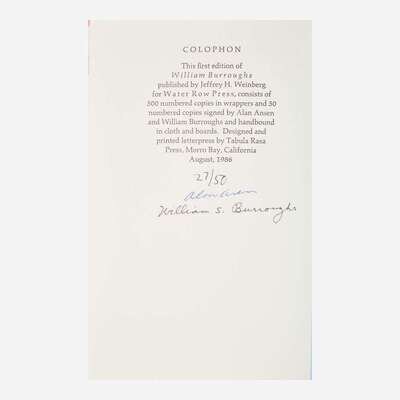 Sudbury, (Massachusetts): Water Row Press, 1986. First and limited edition, #27/50 numbered copies (from a total edition of 550 copies) signed by Burroughs and Ansen. 8vo. 45 pp. Illustrated with mounted photographic frontispiece by Allen Ginsberg. Original blue cloth, stamped in gilt; all edges trimmed.