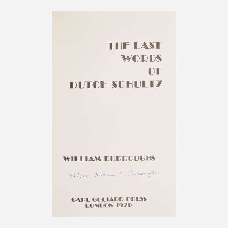 London: Cape Goliard Press, 1970. First and limited edition, #92/100 copies signed and numbered by Burroughs. 8vo. 81 pp. Original olive green buckram, stamped in gilt; all edges trimmed; in original glassine, lightly worn. Maynard and Miles A17a