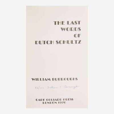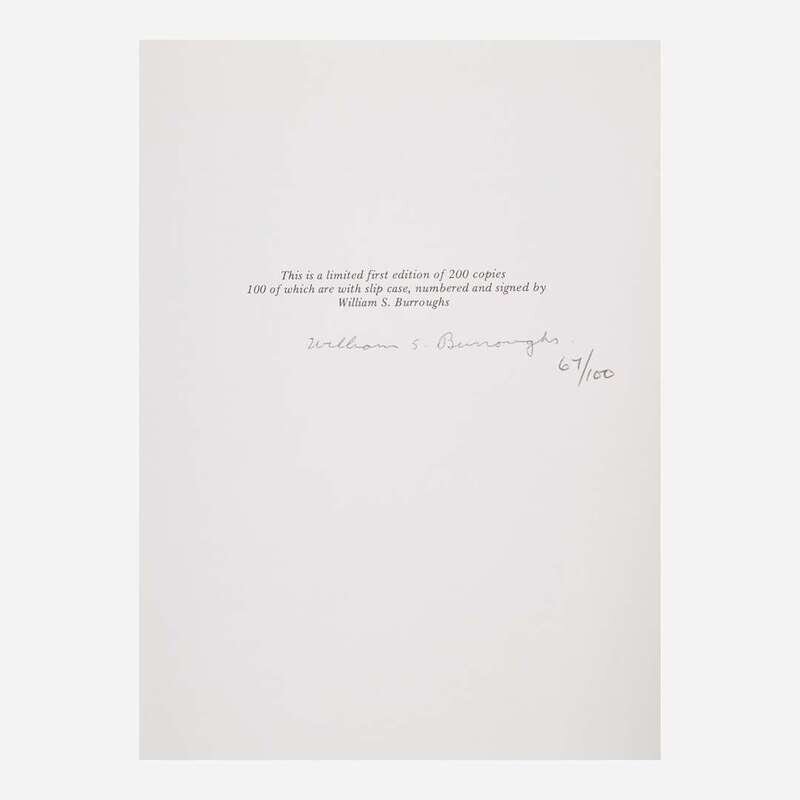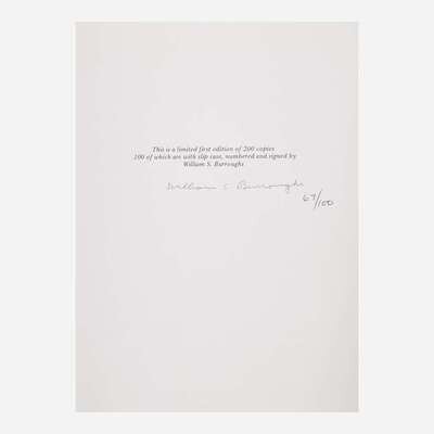 London: Covent Garden Press Limited/Ollon, Switzerland: Am Here Books, 1973. First and limited edition, #67/100 numbered copies (from a total edition of 200 copies) signed by Burroughs. 4to. 133 pp. Original white paper-covered boards, stamped in black; all edges trimmed; in original dust-jacket; in original white slip case.