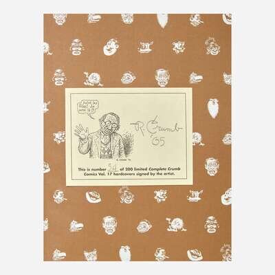 (Westlake Village, CA, and Seattle, Washington): Fantagraphics Books, 1987-2005. In 17 volumes. First and limited editions, each with their own limitation and each signed by Crumb on mounted or loose printed labels: Vol. 1 signed by Crumb on front free endpaper with ink stamp limitation number, #000323; Vol. 2: #599/600; Vol. 3: #37/400; Vol. 4: #62/600; Vol. 5: #168/600; Vol. 6: #184/600; Vol. 7: #375/400; Vol. 8: #323/400; Vol. 9: #369/400; Vol. 10: #141/400; Vol. 11: #112/400; Vol. 12: #162/400; Vol. 13: #263/400; Vol. 14: #75/250; Vol. 15: #114/300; Vol. 16: #170/300; Vol. 17: # 54/200. Original illustrated paper-covered boards; all edges trimmed. As new.