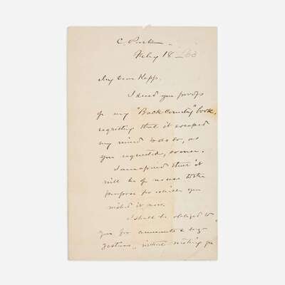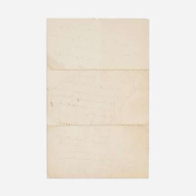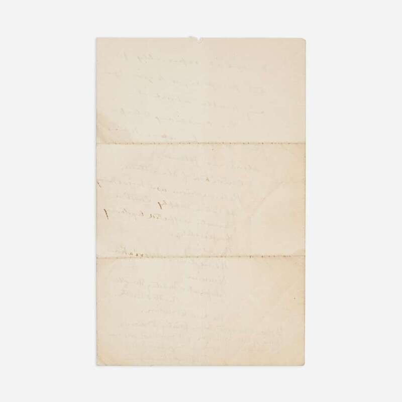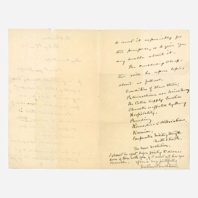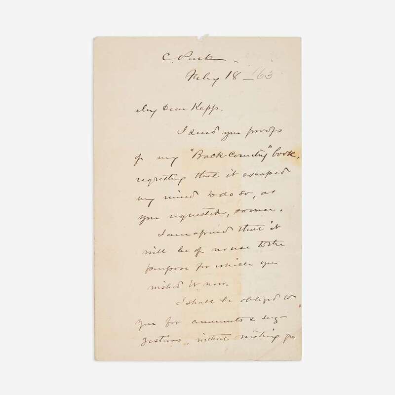 C(entral). Park, (New York), Feb(ruar)y 18, presumed ca. 1858-60 ("'63" in MS. in a different hand at right). One sheet folded to make four pages, 8 1/8 x 5 1/4 in. (206 x 133 mm). Autograph letter, signed by Frederick Law Olmsted, likely as Superintendent of Central Park, to German-American lawyer and journalist, Friedrich Kapp: "My dear Kapp,/I send you proofs/of my 'Back-Country' book,/regretting that it escaped/my mind to do so, as/you requested, sooner./I am afraid that it/will be of no use to the/purpose for which you/(illegible) it now./I shall be obliged to/you for comments & sug--/gestions, without wishing you/to read it especially for/this purpose, or to give you/any trouble about it--/The concluding chap-/ters will be upon topics/about as follows./Condition of Slave States;/Patriarchism as a Social Thing/The Cotton Supply Question/Character as affected by Having/Hospitality./Breeding/Remedies & Alleviations,/(illegible),/Comparative Military Strength/North & South./The new revolution./I should be glad before printing to discuss/some of these with you, if it would not bore you/too much./Yours very faithfully/Fred Law Olmsted". Creasing from original folds.
