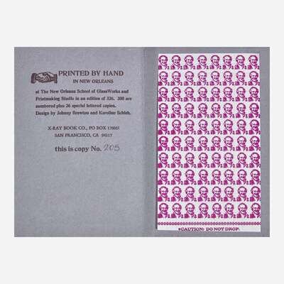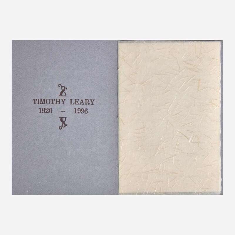 San Francisco, CA: X-Ray Book Co., (1996). First and limited edition, #205/300 numbered copies (from a total edition of 326 copies). 12mo. 2 pp. Original stiff handmade light purple wrappers, stamped in dark purple; translucent handmade paper endleaves; simulated acid blotter sheet with Leary's portrait, tipped-in at rear wrapper, as issued.