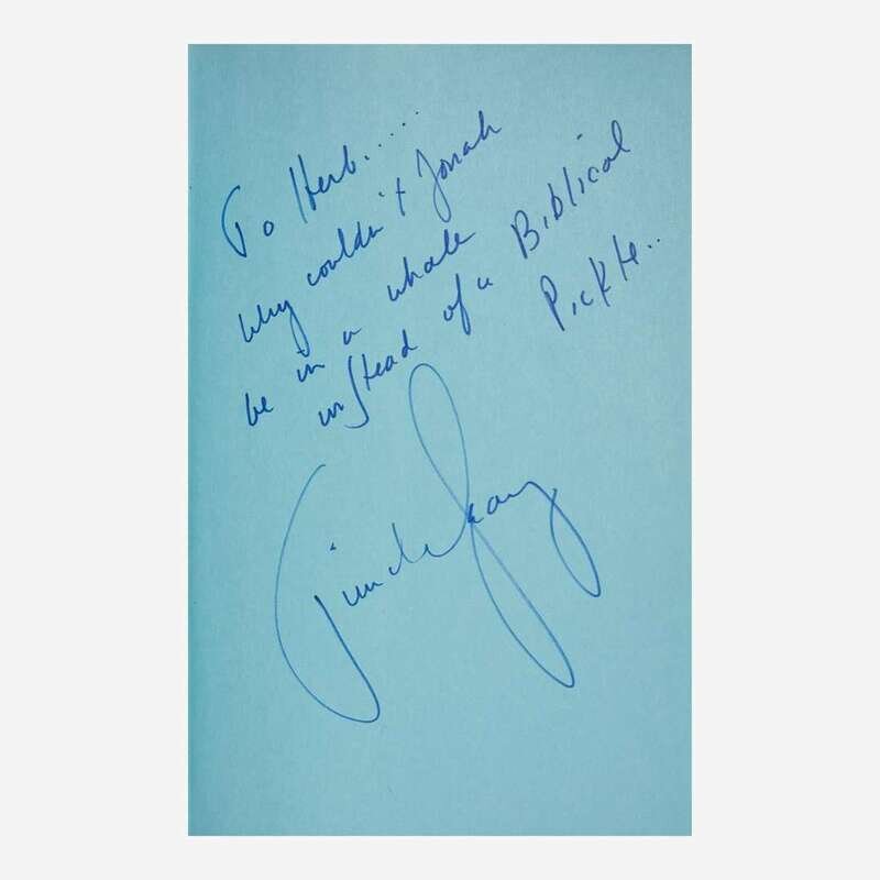 Los Angeles: J.P. Tarcher, Inc., (1983). First edition. 8vo. 395, (2) pp. Inscribed by Leary on front free endpaper, "To Herb.../Why couldn't Jonah/be in a whale/instead of a Biblical/Pickle.../Timothy Leary." Original black cloth over black paper-covered boards, stamped in pink; all edges trimmed; in original silver dust-jacket. Horowitz, Walls & Smith A25a