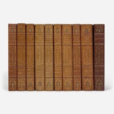 Boston: Issued by the Bibliophile Society, 1901-04. In 10 volumes (seven parts in nine volumes, plus one volume of A Thousand Horatian Quotations). First and limited edition, printed for members only, #377/467 numbered copies (Vol. II-Part I #230). 8vo. Edited by Clement Lawrence Smith. Illustrated with engraved frontispieces and engraved plates in two states, by Howard Pyle, W.H.W. Bicknell, James Fagan, and Edmund Garrett, with the first state of each plate signed by the artist in pencil, and each with a captioned tissue guard; numerous head- and tail-pieces, and other in-text illustrations, and photographic reproductions in the final volume. Beautifully bound in full brown crushed levant, elaborately tooled in a gilt foliate pattern with red and green onlay, scattered light soiling to boards, scattered rubbing to joints and extremities, spines variously faded; top edges gilt, other edges untrimmed; matching gilt foliate dentelles; marbled endpapers.