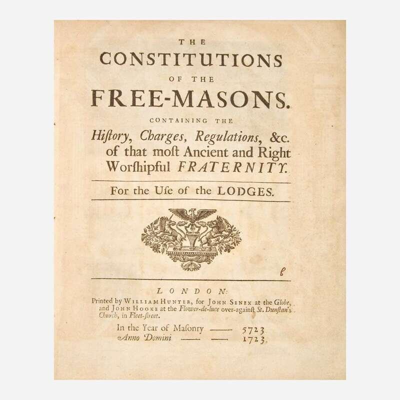 A rare and complete copy of the second book ever printed on freemasonry. Anderson's influential text was published only six years following the establishment of the first Grand Lodge in England, and is preceded only by the extremely rare Old Constitutions, published by J. Roberts in 1722 (ESTC locates only three copies). This edition became the standard work of reference for freemasonry until the end of the Victorian era, and went through 24 editions between 1723-1897. It is divided into three sections: a history of freemasonry, charges to which all freemasons are to adhere, and regulations governing masonic lodges.