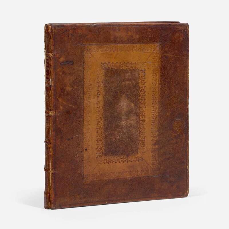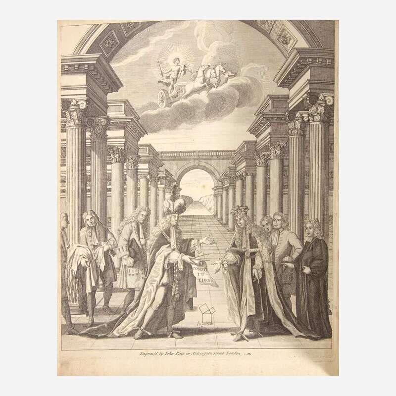 London: Printed by William Hunter, for John Senex and John Hooke, 1723. First edition. Square 8vo. (viii), 91, (1) (ads) pp, including half-title. Illustrated with an engraved frontispiece by John Pine, and six-pages of printed musical scores. Contemporary paneled brown speckled calf, stamped in blind and in gilt, front and rear boards separated but holding; all edges trimmed; scattered minor soiling and spotting to text; armorial book-plate of Sir Darcy Lever Esquire (d. 1743), High Sheriff of Lancashire, England; in blue cloth fall-down-back box. Vibert 1, p. 13, "Perfect copies with the half-title are very rare."; ESTC T86287