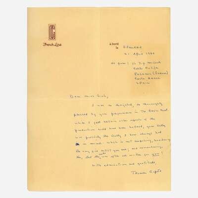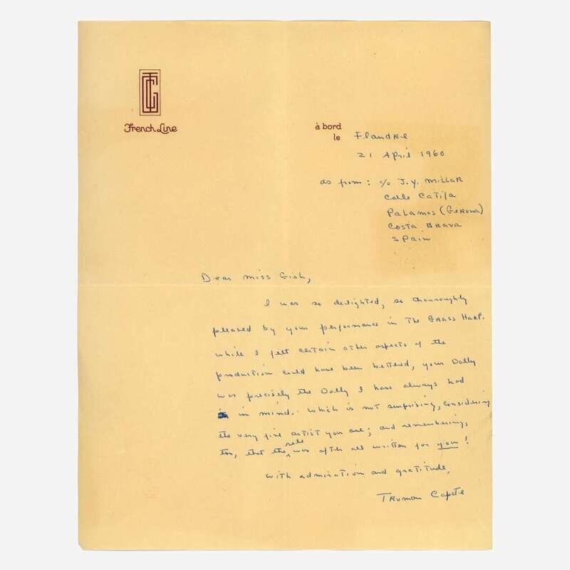 Aboard the French Line ship Flandre, April, 21, 1960. One sheet, 10 5/8 x 8 3/8 in. (270 x 213 mm). Autograph letter on French Line stationery, signed by Truman Capote, to American actress, Lillian Gish: "Dear miss Gish,/I was so delighted, so thoroughly/pleased by your performance in The Grass Harp./While I felt certain other aspects of the/production could have been bettered, your Dolly/was precisely the Dolly I have always had/in mind. Which is not surprising, considering/the very fine artist you are; and remembering,/too, that the role was after all written for you!/With admiration and gratitude,/Truman Capote". Creasing from contemporary folds.