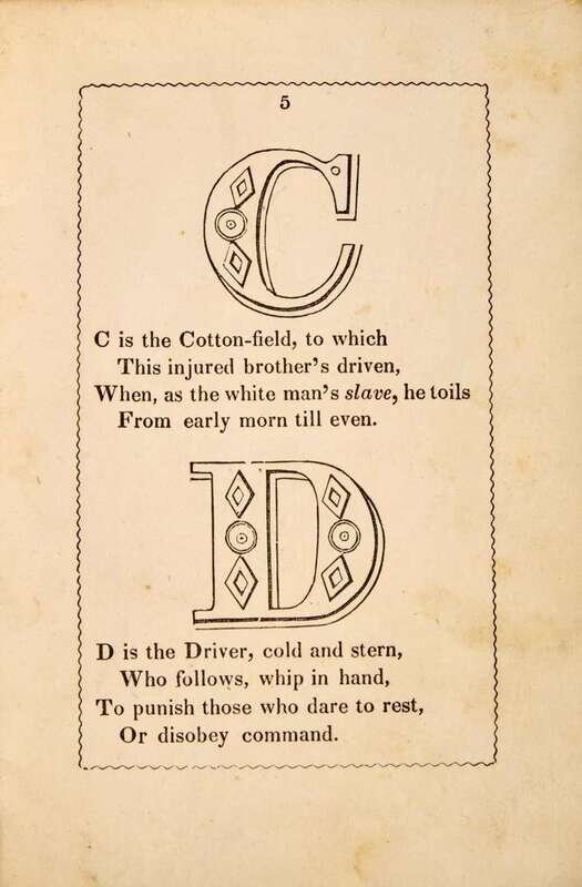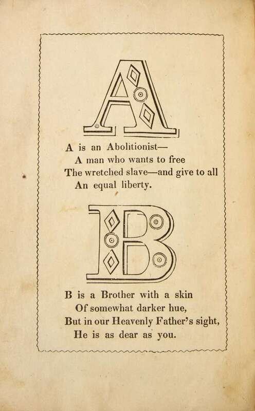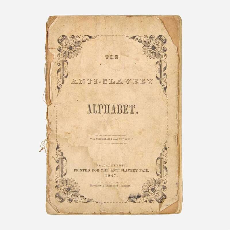 Philadelphia: Printed for the Anti-Slavery Fair, 1847. Second edition. 12mo. (viii), 5-16 pp. Illustrated with 26 uncolored wood-engraved letters. Original stiff printed paper wrappers, original thread intact, front and rear wrapper starting, spine worn, wrappers worn with scattered loss and dampstaining; contemporary ownership signatures on front endpapers and within printed wreath on p. (iv); scattered light soiling and foxing to text leaves.