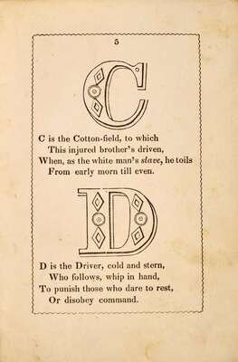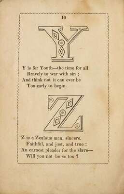 A scarce and unsophisticated second edition of this popular abolitionist pamphlet for children, printed and sold by the Philadelphia Female Anti-Slavery Society. First published anonymously in 1846 and sold at the Philadelphia Anti-Slavery Fair, this pamphlet's authorship has now been attributed to Quaker sisters Hannah and Mary Townsend. Created in order to inform a younger generation about the horrors of slavery and to teach them abolitionist practices, the Alphabet opens with a poem "To Our Little Readers," that encourages children to partake in the abolitionist movement by discussing slavery with their peers and boycotting goods harvested and made by slave labor. The pamphlet then goes through the alphabet ascribing concepts related to slavery to each letter and with an accompanying short incisive poem: "A is an Abolitionist--/A man who wants to free/The wretched slave--and give to all/An equal liberty."; "M is the Merchant of the north,/Who buys what slaves produce--/So they are stolen, whipped and worked,/For his, and for our use."; "S is the Sugar, that the slave/Is toiling hard to make,/To put into your pie and tea,/Your candy, and your cake."; "Z is a Zealous man, sincere,/Faithful, and just, and true;/An earnest pleader for the slave--/Will you not be so too?"