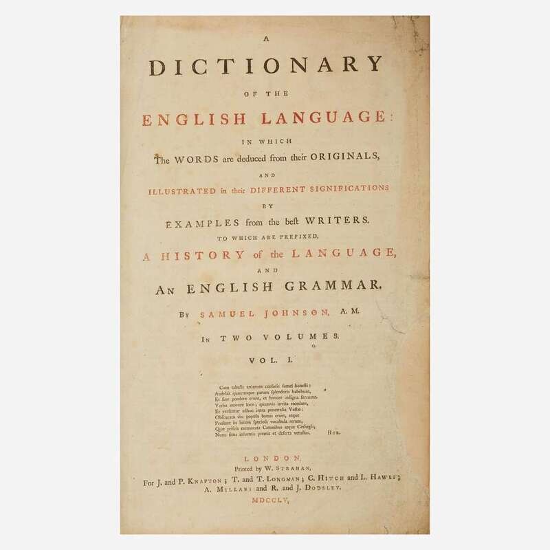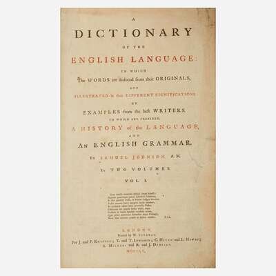First edition of Johnson's magnum opus, often considered one of the greatest works in the English language. "Dr. Johnson performed with his Dictionary the most amazing, enduring and endearing one-man feat in the field of lexicography...it took Johnson less than ten years from writing his first prospectus in 1746 to publication day, 14 June 1755...Johnson's Dictionary is divided into four parts: the preface, in which he expounds--largely in the steps of Ephraim Chambers--the aims and problems of lexicography; a history and a grammar of the English language...and finally the dictionary proper...Johnson introduced into English lexicography principles which had already been accepted in Europe but were quite novel in mid-eighteenth-century England. He codified the spelling of English words; he gave full and lucid definitions of their meanings (often entertainingly coloured by his High Church and Tory propensities); and he adduced extensive and apt illustrations from a wide range of authoratative writers." (John Carter, Printing and the Mind of Man, pp. 121)