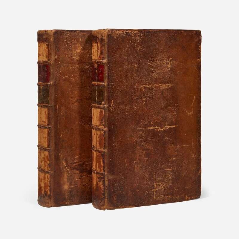 London: Printed by W. Strahan, For J. and P. Knapton, et al., 1755. In two volumes. First edition. Thick folio. Unpaginated. Title-pages printed in red and black; text printed in double column. Full contemporary calf, original red and green morocco spine labels, stamped in gilt, rebacked, corners and edges sometime renewed, boards rubbed and scratched, spines worn and dry, cracked, and splitting; red speckled edges; title-page of first volume repaired along fore-edge and top corner, wear along bottom edge of same; front free endpaper, title-page and first two leaves of Preface starting; bottom corner of leaf 21M clipped but not affecting text; small repair in bottom corner of terminal leaf in second volume; scattered light to moderate foxing and toning in each volume; scattered dampstaining in bottom edge of several rear leaves in each volume; title-page in second volume creased; armorial book-plate of Thomas Handasyde on front paste-down of each volume. Courtney & Smith, p. 54; Fleeman 55.4D/1a; PMM 201
