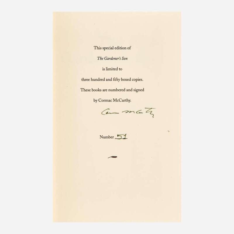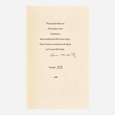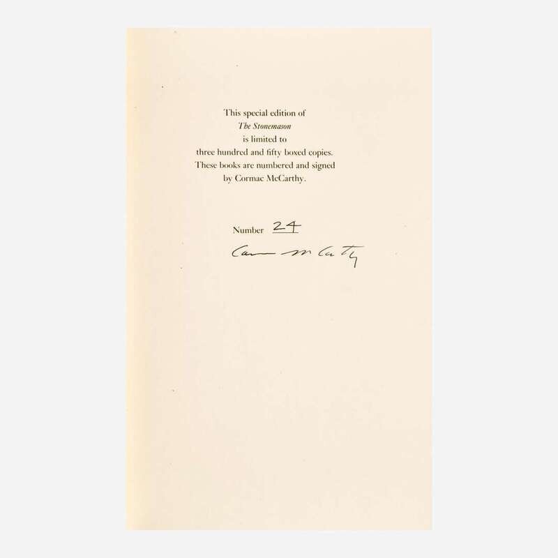 (Hopewell, New Jersey): The Ecco Press, (1994). First and limited edition, #24/350 numbered copies signed by McCarthy. 8vo. (viii), 133 pp. Original black cloth over grey paper-coverd boards, stamped in blind and in silver; all edges trimmed; in original red cloth slip case.