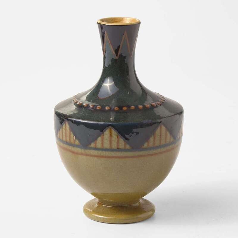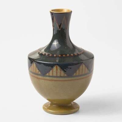 A small footed form, slip-decorated in a geometric pattern. Marsden was briefly employed at Etruria as a decorator of Art Wares.