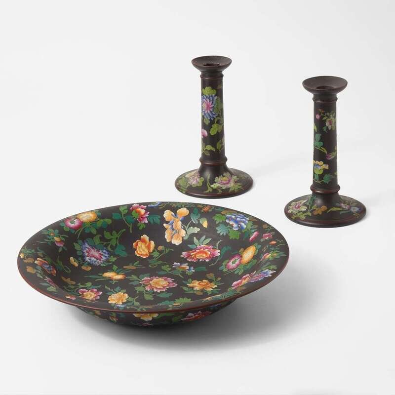 Comprised of a pair of tall candlesticks and a large (shape 6355) Lily Bowl. Made for Marshall Field & Co, decorated in the "Chinese Flowers" pattern.