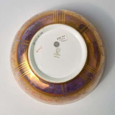Imperial shape, "Hawk" interior center design, "Magpie and Masks" (without masks) interior border; unknown exterior design. Decorated by Makeig-Jones.