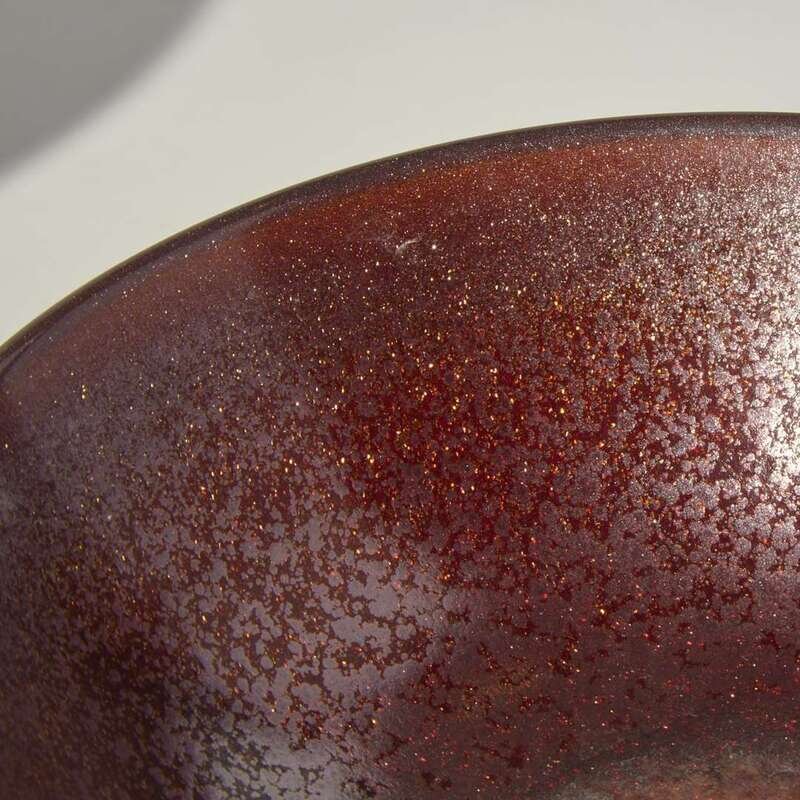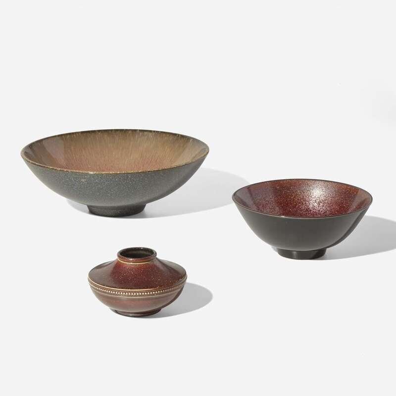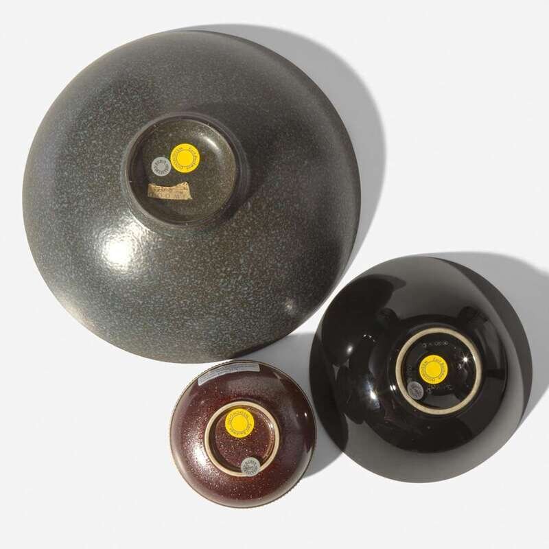 Consisting of two bowls and a small, squat vase. The smaller bowl and vase glazed in a crystalline "Aventurine" glaze. The larger glazed in purple gray (interior) and mottled gray (exterior).