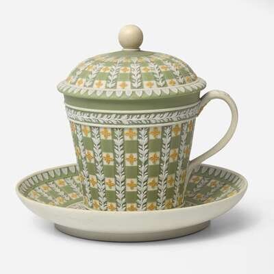 A Wedgwood Tricolor Diced Jasperware Lidded Chocolate Cup and Saucer UK, circa 1800