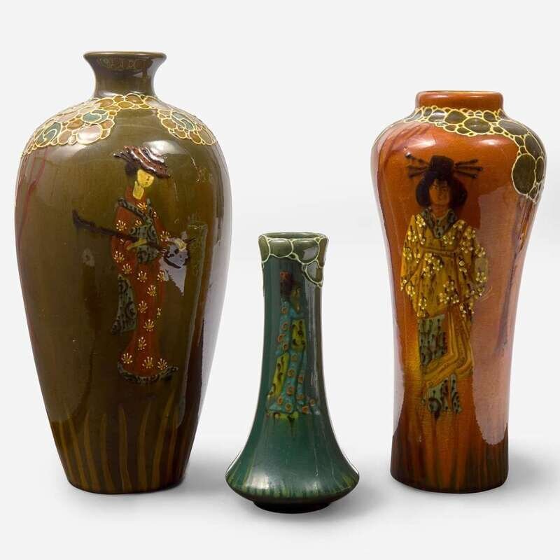 Frederick Hurten Rhead (British-American, 1880-1942) Three Faience Vases with Geishas, Weller, USA, circa 1903