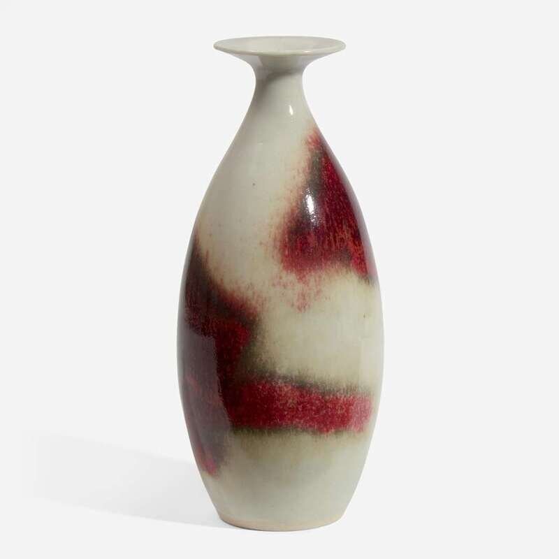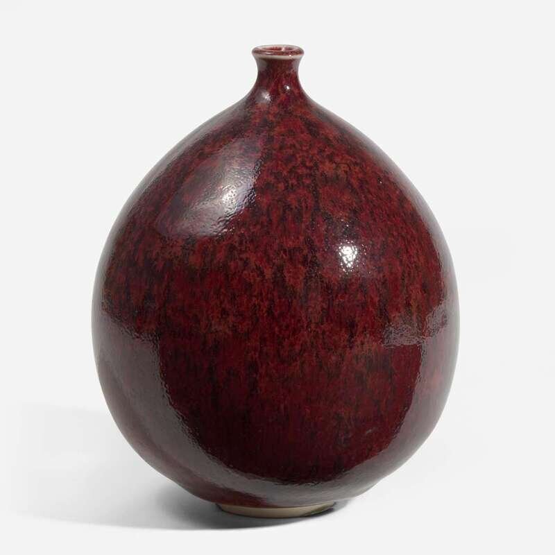 Porcelain, textured-iron glaze, copper red on celadon glaze, "Ashes of Rose" glaze