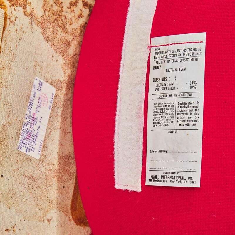 Knoll International paper labels applied to underside of cushion and seat bench
