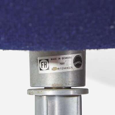 Applied label to top of chair column: "FH, Made in Denmark, 7001, Fritzhansen" with Danish furniture maker's control logo.