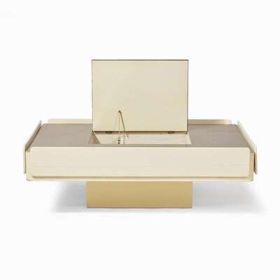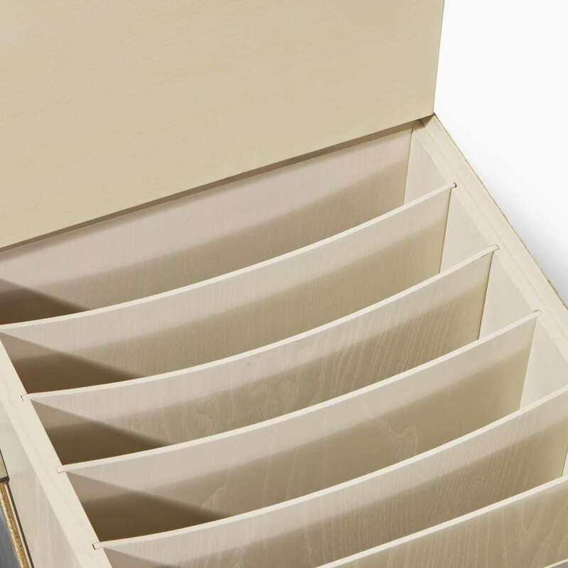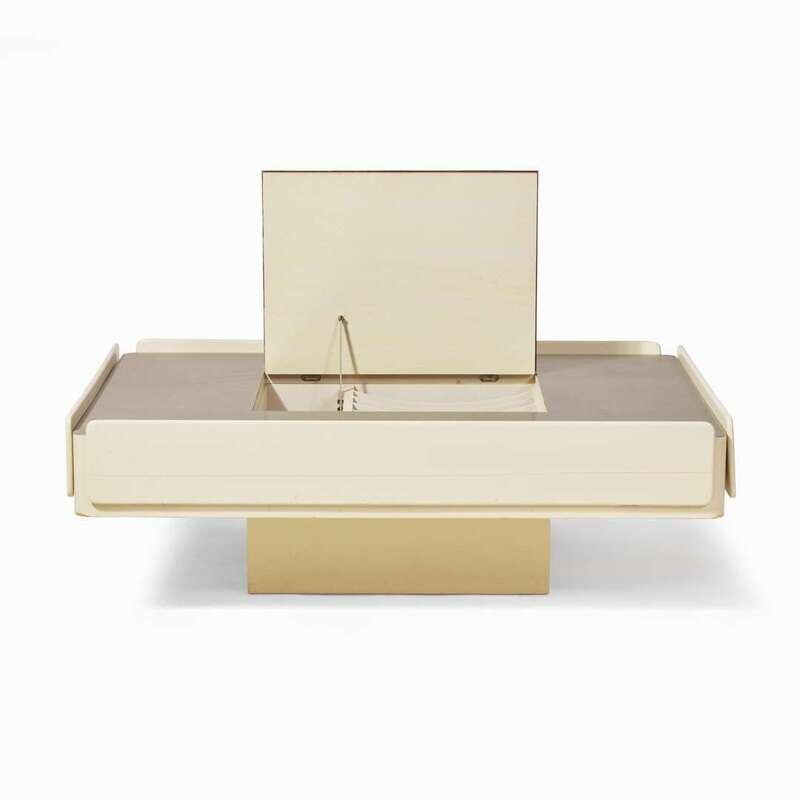 With drawers on all sides and a lidded center compartment concealing record storage