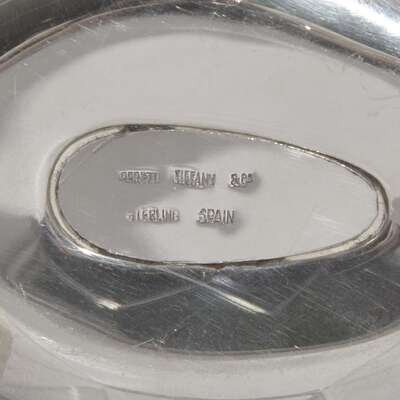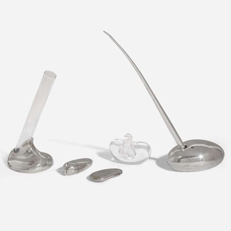 Comprising a sterling pen and bean-form pen holder, sterling and glass bud vase with removable glass vial, rare rock crystal scent bottle, silverplate bean locket necklace, and a sterling pill box