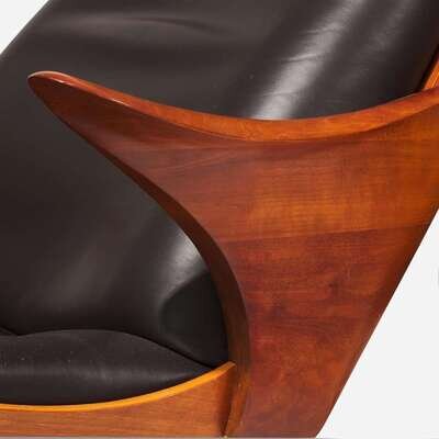 Carved and stack-laminated cherry, cherry plywood, cast bronze, leather