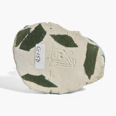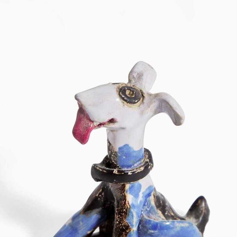 Seven figurines, along with two glazed earthenware pins with metal pinbacks