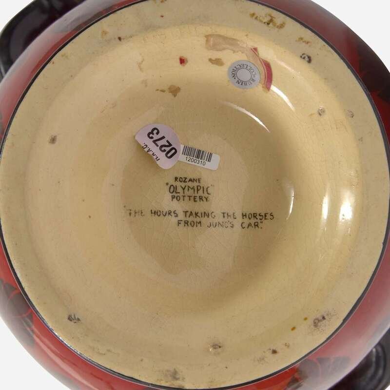 Marked to underside: "ROZANE "OLYMPIC" POTTERY, THE HOURS TAKING THE HORSES FROM JUNO'S CAR"