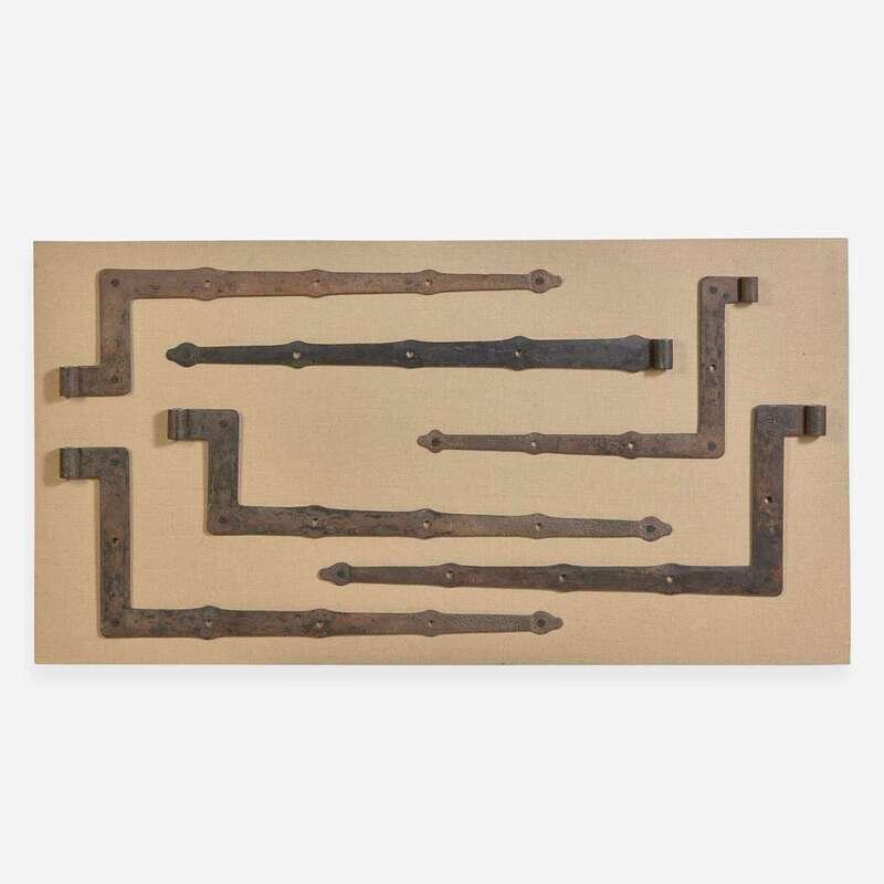 Comprising six strap hinges (the longest 29 3/4 in.) screwed to burlap-covered composite board, with aluminum French cleat to rear