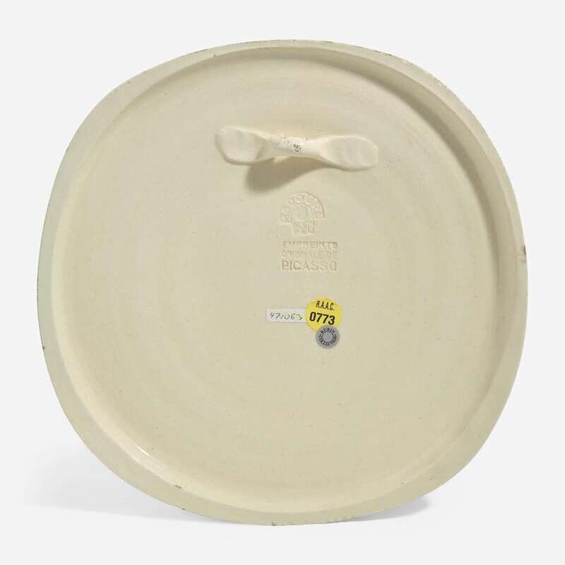 1956, edition of 450, stamped 'MADOURA PLEIN FEU' and 'EMPREINTE ORIGINALE DE PICASSO' on the underside. White earthenware ceramic convex wall plaque, with engraving accentuated with oxidized paraffin and glaze bath.