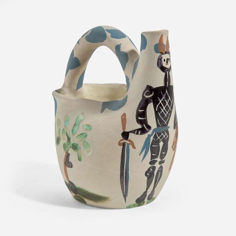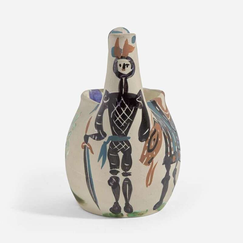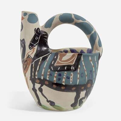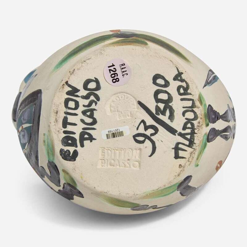 1952, numbered 93/300, inscribed ‘EDITION PICASSO' and 'MADOURA', and stamped 'MADOURA PLEIN FEU' and 'EDITION PICASSO' on the underside. White earthenware ceramic pitcher, partially engraved, with colored engobe and glaze.