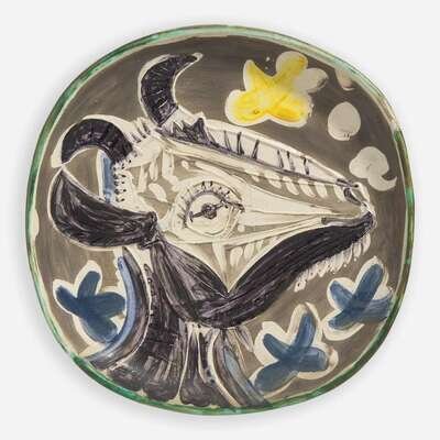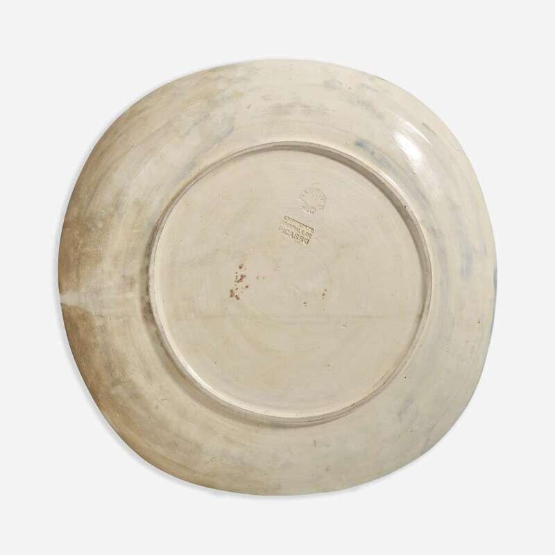 1952, from the edition of 100, stamped 'MADOURA PLEIN FEU' and 'EMPREINTE ORIGINALE DE PICASSO' on the underside. White earthenware clay dish with decoration in engobes under partial brushed glaze.