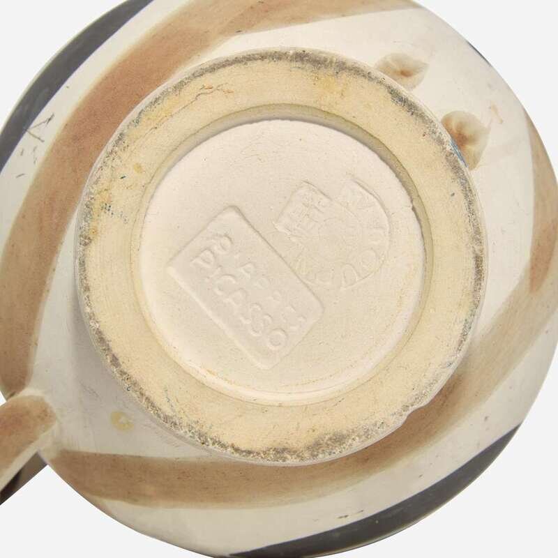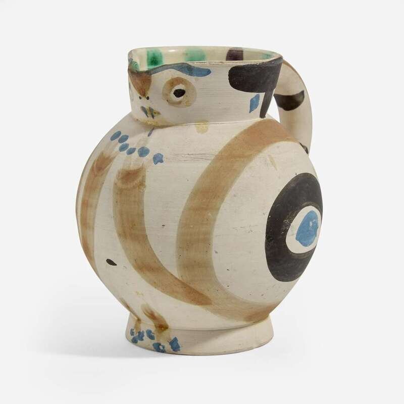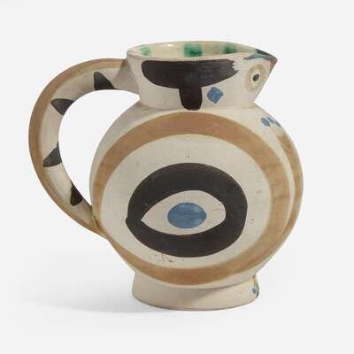1949, from the edition of 200, white earthenware ceramic pitcher with colored engobe and glaze.