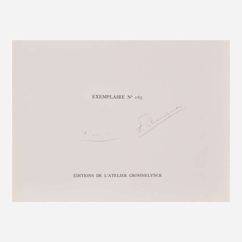 1968, pencil signed by artist and author, and number 165 (from the edition of 200 on Vélin de Rives), Éditions de l'Atelier Crommelynck, Paris, publisher. Illustrated with 12 hors-texte etchings and aquatints by Pablo Picasso. Loose sheets (as issued), vellum cover, publisher's red slipcase.