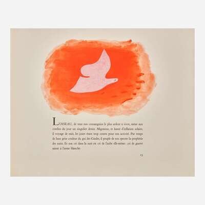 1962, ink signed on the colophon by the artist and poet and annotated 'EXAMPLAIRE 55' (from the edition of 100, there were also 20 hors commerce and an edition of 30 in Roman numerals with an additional suite), the full sheets, Aldo Crommelylnck, Paris, printer, Au vent d'Arles, Paris, publisher. The complete bound volume with 12 aquatints in colors on Richard de Bas handmade paper.